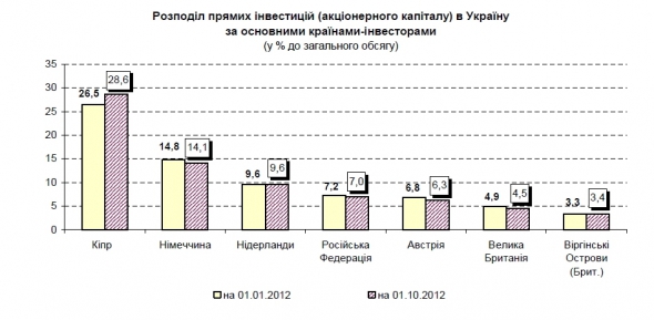 Іноземні інвестори у січні-вересні 2012 року вклали в економіку України $4 млрд 319,1 млн прямих інвестицій.
