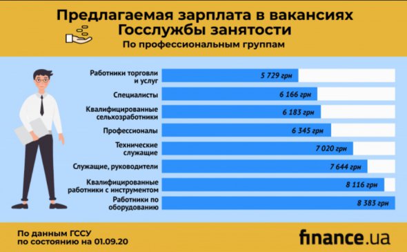 Також роботу пропонували вчителям, вихователям, інженерам, провізорам, психологам, лікарям, економістам. Зі сфери торгівлі і послуг шукали продавців, кухарів, охоронців, офіціантів, санітарок, барменів, поліцейських.