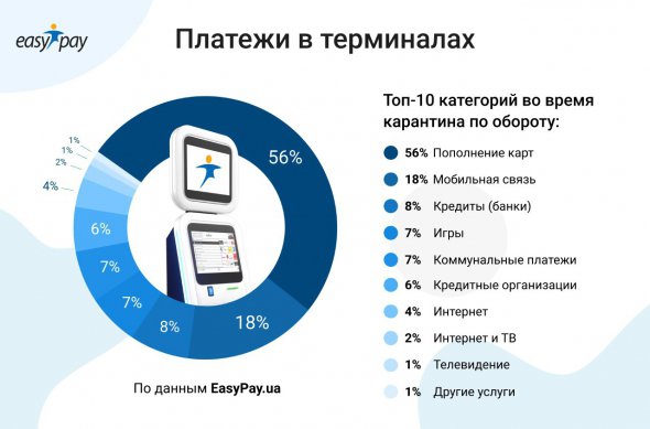 Після введення карантину за обігом в терміналах зросли лише дві категорії з топ-10: "Комунальні платежі - на 30% і Cash2Card - на 21%. У решті категорій з топ-10 обіг упав. Найсильніше - в "Інтернет і ТБ" (-22%).