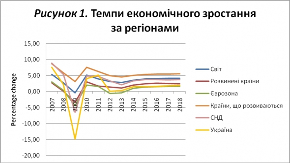 Виходячи з даних (Рис. 1), зростання ВВП України до кризи слідувало тенденції економічного зростання Співдружності Незалежних Держав (СНД). З іншого боку, можна відмітити деякі зміни: з початку 2012 року зростання ВВП України є більш корельовано зі зростанням ВВП європейської зони. Більше того, за прогнозами економістів МВФ, зростання ВВП України до 2018 вказує на збільшенням кореляції між темпами зростання ВВП України і єврозони. Це, у свою чергу означає, що як економічні проблеми та і економічне зростання в Європі можуть мати досить вагомий вплив на економіку України.