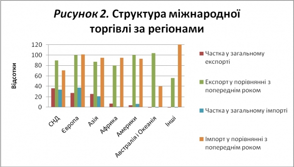 Збільшення кореляції темпів економічного зростання України та європейської зони можна пояснити рядом причин. Однією з них є те, що європейський простір відіграє усе більшу роль у міжнародній торгівлі країни. За період з січня по серпень 2013 експорт та імпорт товарів і послуг України скоротився порівняно з аналогічним періодом 2012 року (Рис. 2). Однак відмічається менше падіння обсягів експорту до європейських країн ніж до країн СНД (99,9% і 86,6% відповідно). Крім того, імпорт з європейських країн збільшився на 1,4 %, у той час як імпорт до країн СНД знизився на 29,2%. Однією з позитивних тенденцій є збільшення диверсифікації торгівельних партнерів, яке характеризується зниженням частки експорту та імпорту з країн СНД і збільшення частки експорту та імпорту з таких регіонів як Європа, Азія і Африка (Рис. 2).