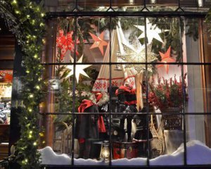 В дорогих магазинах, таких як ювелірні товари, шуби, білизна вітрину оформляють красивими матеріалами, дорогими кулями, ставлять цілі композиції. Цього року популярно ставити композицію людей у гарних костюмах біля карет.