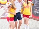 Студентка аграрного університету Олена Захарова тримає прапор однієї з компанії мобільного зв'язку у фан-зоні на Хрещатику. Рекламує вигідний для іноземців тариф. На роботу вона влаштувалася ще на початку травня.