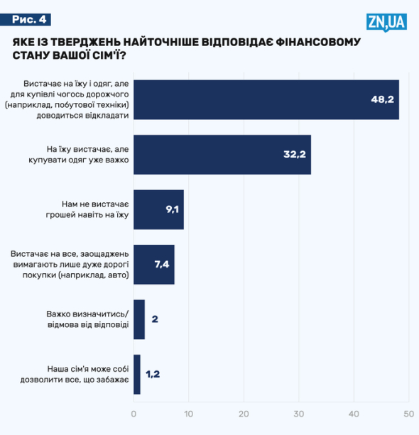 Ще 9% сімей українців не вистачає грошей навіть на їжу. Тільки 7,4% опитаних вистачає на все, вони заощаджують лише для дуже дорогих покупок (наприклад, автомобіля).