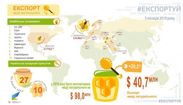 За 5 місяців 2019-го збільшила обсяги продажу меду за кордон на 20,2% порівняно з аналогічним періодом минулого року, повідомили у Мінекономрозвитку.