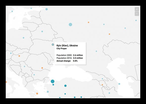 Сервіс візуалізації даних Datawrapper розробив онлайн-карту коливань чисельності населення великих міст.