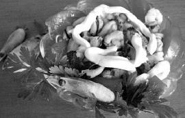 — Удома мідії проварюю до готовності й мариную з цибулею, скропленою лимонним соком. Роблю так для того, аби цибуля не гірчила. Заправляю олією.