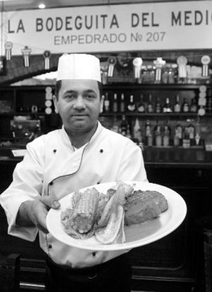 У столичному ресторані "Ла Бодегіта дель Медіо" пропонують весняне меню. Шеф-кухар 48-річний Сіро Перес готує салат "Марікоца", гарнір "Морос і Крестіанос" та свинину "Чулетос". Для салату нарізує болгарський перець, свіжі огірки, помідори.