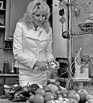 Леся Григорівна у коричневій трикотажній кофті й штанях. Має зачіску "каре". Біляве волосся доглянуте, кінці підкручені. У кухні на серванті велика корзина з виноградом, яблуками і мандаринами.