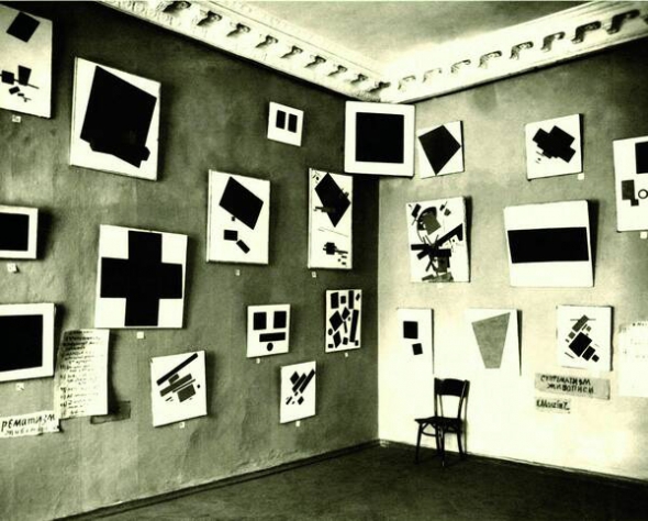 Серед експонатів виставки представлено найвідоміший витвір Малевича – картину "Чорний квадрат". Уперше він використав цей образ на два роки раніше, коли малював декорації до опери Михайла Матюшина "Перемога над Сонцем". Квадратом замінив сонце.