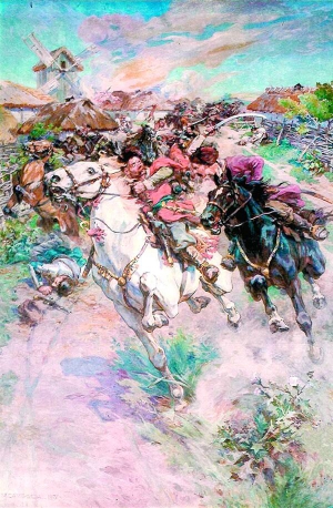 Микола Самокиш. Картина написана 1931-го. На ній зображений бій Івана Богуна і Стефана Чарнецького під Монастирищем у 1653 році. Через два роки козацький полковник Богун і польський шляхтич Чарнецький зійдуться у битві біля Охматова