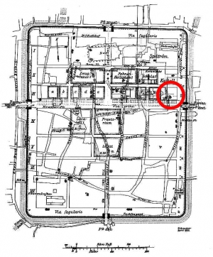 На місці знайденої будівлі розташовувався в 1024 році суд єпископа Бамберга, потім 1641 року - монастир кармелітів з броварнею. Тут же була виявлена ??римська табличка, колись прикріплена до східних воріт табору, Porta Principatis Dextra. До 1912 року - готель Регенсбург.