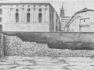 Перша синагога середмістя була зведена у фахверковій конструкції – з дерев'яним каркасом наповненим камінням, під високим черепичним дахом. Вона згоріла 3 червня 1527 року.