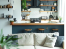 Використовуйте стелажі для зберігання посуду, банок зі спеціями чи кухонного декору. Відкриті полиці створять відчуття простору.