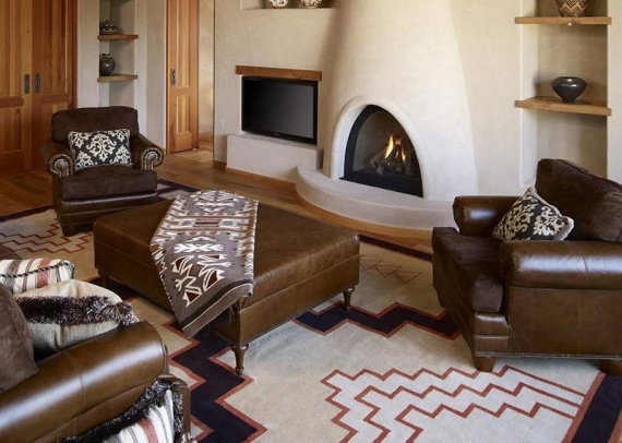 Виділена одна чи дві протилежні стіни декоративним рельєфним покриттям в теплих тонах виглядає досить доречно. Структура стін здебільшого повторює природні матеріали притаманні даній місцевості. Проте яскравими акцентами виступає колоритний текстиль, пледи оздоблені геометричним національним узором.