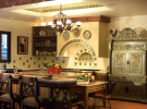 Мексиканський стиль дизайну інтер'єру кухні передбачає достатньо простору та оптимальну зручність. На стінах зазвичай традиційна декоративна штукатурка, плитка яскравих охристих та темно-червоних відтінках. Підлога вкладена керамічною плиткою насичених кольорів.
