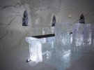 До послуг гостей тут 24 номери, 10 з яких - люкси, кожен прикрашений льодово-сніговою скульптурою в стіні. Температура всередині -5°С, коли на вулиці -12°С. Не замерзнути допоможе теплий спальний мішок і чашка гарячого ягідного соку вранці.
