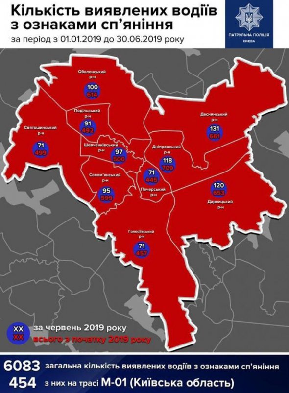 У червні найбільше водіїв у стані алкогольного сп'яніння в Києві зафіксували в Деснянському та Дарницькому районах.