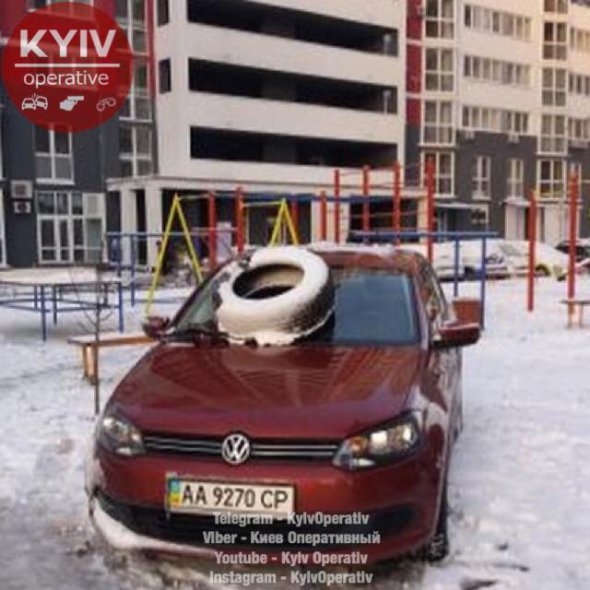 Кияни "прикрасили" капот автомобіля старим колесом - поки що як попередження.