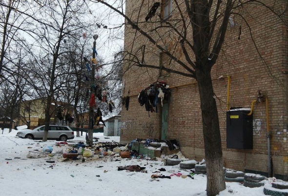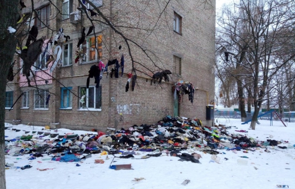 Із вікна будинку на вулиці Зодчих ввечері 13 лютого повикидали старий одяг.