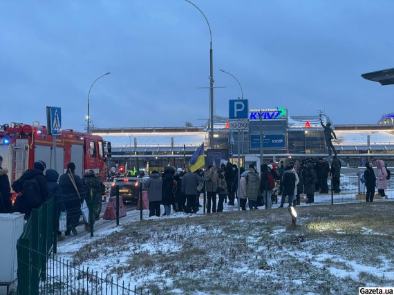 Серед присутніх багато представників партії "Європейська солідарність". Також до летовища з'їхалися кияни і жителі інших областей. Аеропорт посилено охороняють, на під'їзді до нього чималі затори. Стоять автобуси із силовиками. Усередину аеропорту пускають лише тих, хто має квитки на рейси, повідомляє кореспондентка Gazeta.ua.