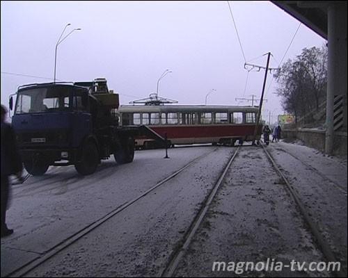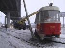 За словами водія травмаю N5, неподалік від мосту Метро один з вагонів несподівано злетів з рейок і, зачепивши стовп трамвайного електроживлення, розвернувся на дев"яносто градусів. У момент аварії в салоні трамваю, за словами водія, знаходилося п"ять-шість пасажирів. Внаслідок пригоди ніхто з них не постраждав.