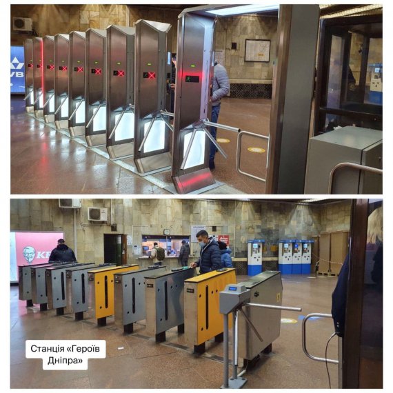 Заміну старих турнікетних груп у київській підземці анонсували у вересні. Окрім Героїв Дніпра, сучасні турнікети вже є на станції Сирець. Вони приблизно вдвічі вищі за старі пристрої для обмеження проходу пасажирів. До кінця 2020 року нові моделі маю бути на 15 станціях.