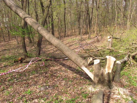 Більше сотні дерев спиляли невідомі у заповідному урочищі Бичок в столиці. Це сталося уночі 10 квітня. Серед спиляних дерев були вікові дуби.