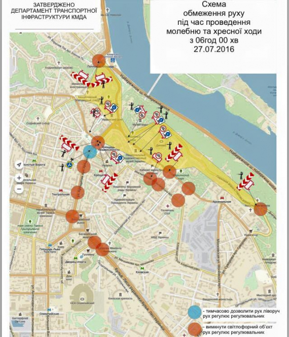 "Рух буде перекрито на таких вулицях та площах: вулиця Грушевського - від Шовковичної до Європейської площі, Європейська площа, Володомирський узвіз - від Поштової до Європейської площі, вулиця Трьохсвятительска, вулиця Хрещатик - від Майдану Незалежності до Європейської площі, вулиця Паркова дорога - від Європейської площі до алеї Героїв Крут", - йдеться у повідомленні.