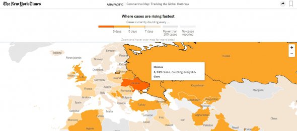 Це видно на інтерактивній мапі щодо поширення коронавірусу у світі, яка оприлюднена на сайті видання.