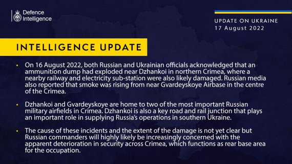 "У Джанкої та Гвардійському базуються два найважливіші російські військові аеродроми в Криму. Джанкой також є ключовим автомобільним і залізничним вузлом, який відіграє важливу роль у забезпеченні російських операцій на півдні України", - зазначають у британському міноборони.