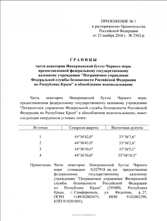 Бухти Інкерманську в Севастополі та Тиху на південному березі Криму віддають у користування прикордонному управлінню Федеральної служби безпеки Росії.