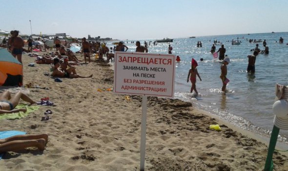 У Криму - 2018 майже не залишилося безпечних пляжів: багато закрили через аварійний стан, частині "віджали" російські військові, а решта – неприбрані. У курортній Євпаторії на пляжі "Лазурному" встановили табличку "Забороняється займати місця на піску без дозволу адміністрації!". На фото видно, що люди, все ж таки, ризикнули прийти на пляж.