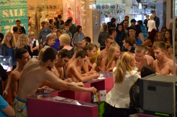 На минулих вихідних до торговельно-розважального комплексу "Квадрат" на просп. Перова у Києві прийшло 150 роздягнених покупців. У магазині проводили акцію "Прийшла роздягнена — пішла одягнена". Всім, хто приходив у купальниках і плавках та брав участь у змаганнях, безкоштовно давали одяг.