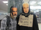 Люди в вагоні фотографують "чільників держави" на свої ґаджети. Поки дійові особи в масках потішають людей, дівчата роздають їм наліпки з закликом прийти на мільйонне віче на Майдан незалежності 8 грудня.