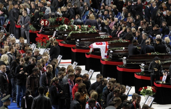 Відспівування загиблих пройшло в суботу рано вранці в Успенському соборі, після чого вболівальники, жителі Ярославля та гості міста отримали можливість попрощатися з командою на хокейній арені, двері якої були відкриті для всіх бажаючих. Поводити в останню путь улюблених гравців, незважаючи на безперервний дощ, прийшли кілька десятків тисяч чоловік. Через велику кількість людей церемонія тривала близько шести годин замість запланованих чотирьох. Близько 500 чоловік не встигли потрапити на арену до її закриття, після чого багато хто з них публічно висловлювали невдоволення з цього приводу.