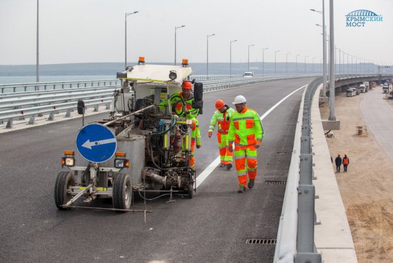 "У Кримського моста два напрямки руху – по дві смуги кожний. На кожному напрямку наноситься по три лінії розмітки: дві крайових і осьова, що розділяє транспортні потоки попутного напрямку. Відповідно, нам належить нанести лінії розмітки загальною протяжністю близько 117 км", – сказав він.