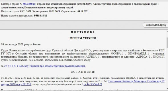 8 листопада Роменський міський районний суд, дослідивши матеріали справи, постановив визнати чоловіка "винуватим у вчиненні адміністративного правопорушення, накласти на нього адміністративне стягнення у виді штрафу у розмірі однієї тисячі неоподатковуваних мінімумів доходів громадян, що становить 17000 (сімнадцять тисяч) гривень", йдеться в документі.