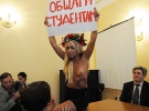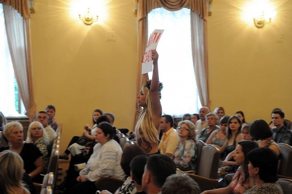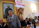 Активістка руху Інна Шевченко, вирвавшись у президію, розгорнула плакат "Общаги - студентам!" і мала намір влаштуватися на нічліг прямо на столі, повідомляється в офіційному блозі Femen.