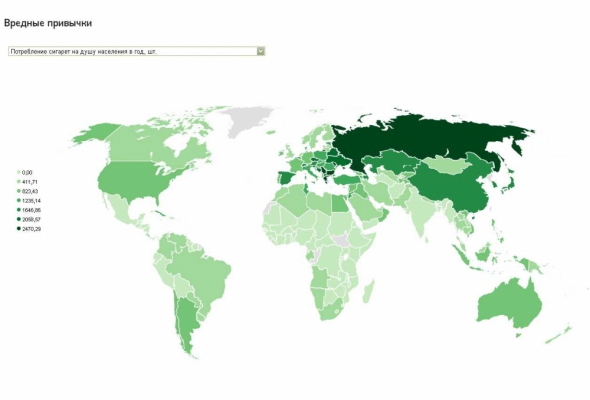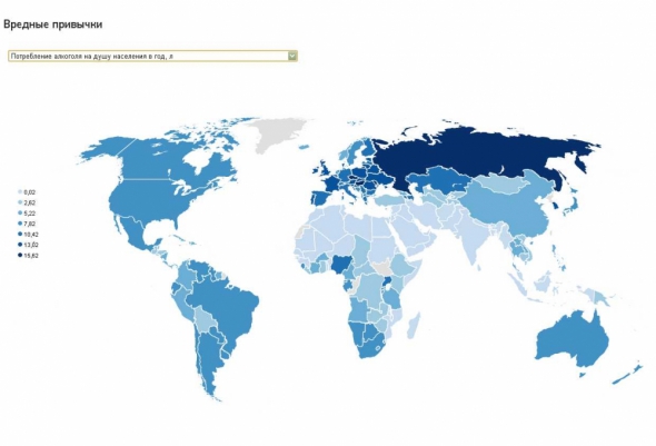 Плюс до 857 викурених сигарет на кожного жителя планети припадає 6,13 л випитого алкоголю, підрахували в ВООЗ. Практично третина цієї рідини - домашнього або нелегального виробництва. Лідер за споживанням алкоголю - Молдавія: більше 18 л на душу населення. Любов до пива привела чехів на друге місце. Слідом за ними йдуть угорці, котрі люблять пиво і вино, та росіяни та українці, які п'ють в основному міцні спиртні напої.
