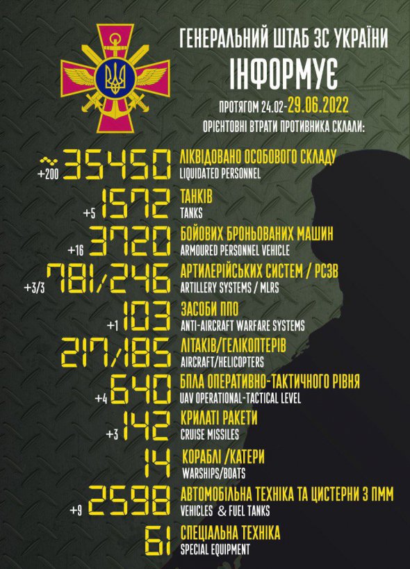 Втрати російських окупантів в Україні на 29 червня становлять 35 450 осіб.