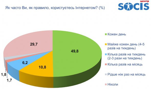 Так, щодня користуються Інтернетом 49,8% опитаних, заходять в мережу 4 - 5 разів на тиждень - 10,8%, 2 - 3 рази - 6,2%, кілька разів на місяць - 1,7%.