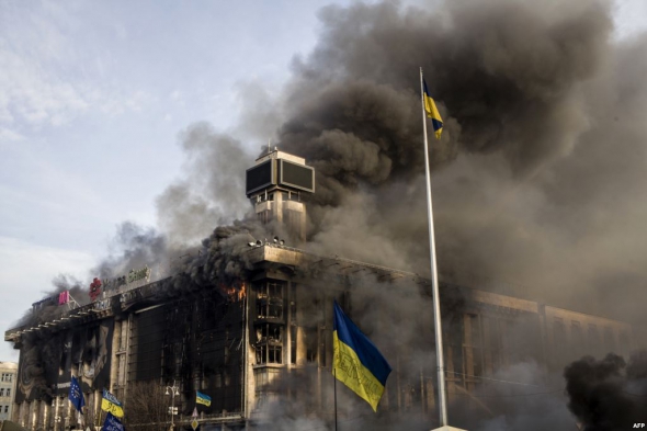 Через два тижні Будинок профспілок вигорів ущент. Пожежу гасили добу: одну особу не врятували, 41 людину таки вдалося витягти із вогню. Рятувальники потім розповіли, що у приміщенні постійно виникали нові осередки вогню. Скаржилися на протестувальників, які нібито перешкоджали роботі. Підпал один одному закидували силовики і "Правий сектор".