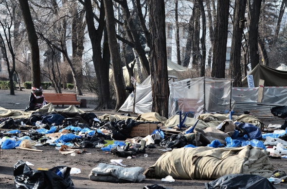 З тріском провалилися плани так званого "антимайдану" протистояти Революції Гідності. Наприкінці лютого "тітушки" й інші небайдужі до грошей почали згортати наметове містечко у Маріїнському парку. Незважаючи на обіцянки навести чистоту і порядок, "сміттєвий колапс" був очевидний. Силами інших людей з парку вивозили купи недоїдків, одягу, матраців.