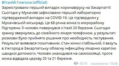 "Сьогодні у Мукачеві зафіксовано перший лабораторно підтверджений випадок на COVID-19. Це підтвердили у Мукачівській міськраді. Це 68-річна жінка із мікрорайону Підгоряни. Її чоловік повернувся з Італії 20 березня", - сказано у повідомленні.