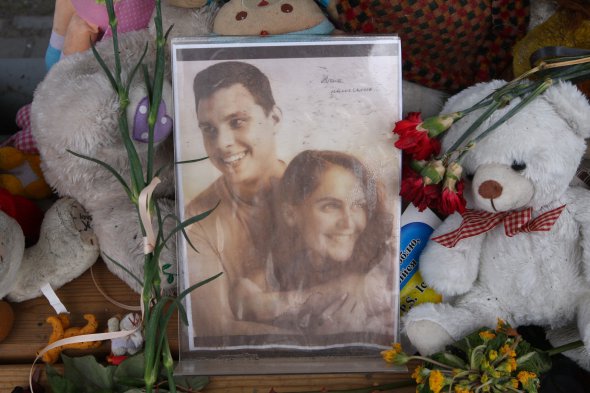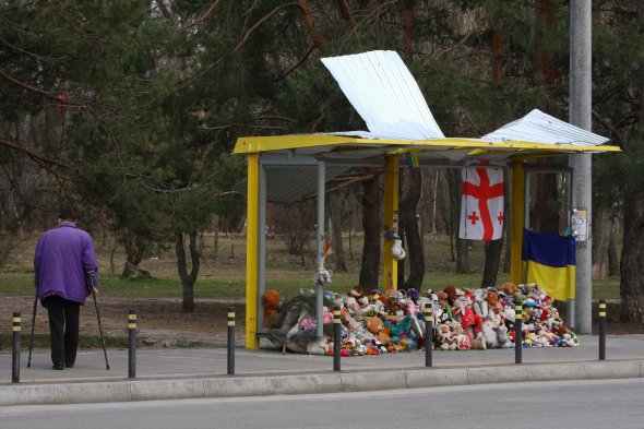 Автобусну зупинку через дорогу від місця прильоту перетворили на меморіал памʼяті. На лавці у кілька рядів сидять дитячі іграшки, з даху звисає грузинський прапор, ліворуч – український стяг. Між мʼякими ведмедями, кониками, зайцями – стоять портрети загиблих того дня людей. Ось у файлику молода пара всміхається, обійнявшись. Лежать квіти – свіжі й уже зівʼялі.