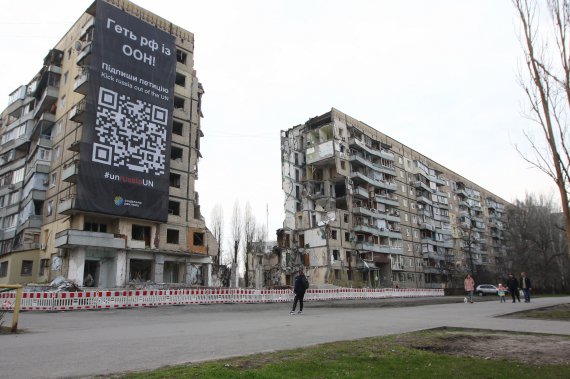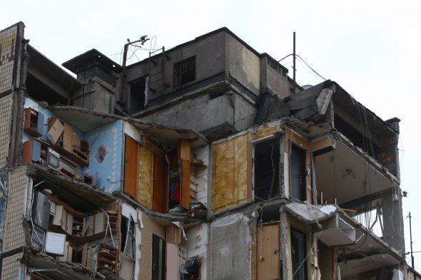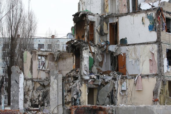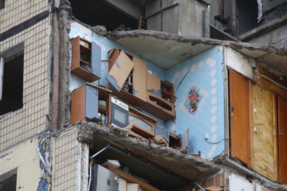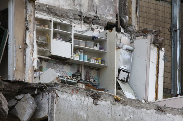 Звідси добре видно квартири, що вціліли на половину. Стіни полетіли додолу й відкрили оку блакитну плитку в кухні, полиці на стіні, повні білого посуду, духові печі й деревʼяні шафи в коридорі.