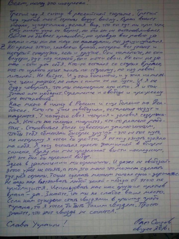 "В ув'язненні ми обмежені. І навіть не свободою, а тим, що мало можемо зробити для країни. Точніше зробити можемо лише одне — триматися. Не треба нас витягувати за будь-яку ціну — перемога від цього не наблизиться. Використовувати нас як зброю проти ворога — так. Знайте, що ми не найслабше ваше місце. Якщо нам судилося стати цвяхами у кришку гробу тирана, то я хотів би стати таким цвяхом. Просто знайте, що цей цвях не зігнеться", - написав Олег Сенцов.