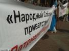 Тим часом дві жінки розгортають плакати "Народный собор приветствует патриарха Кирилла" та "Народный собор за единство русского мира".