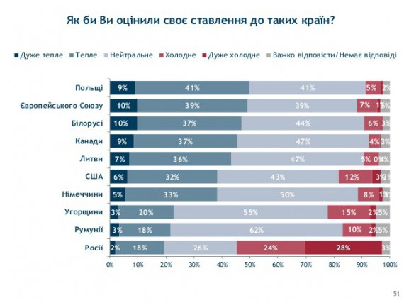 Українці найтепліше ставляться до Польщі (50%), Європейського Союзу в цілому (49%) і Білорусі (47%). Відсоток опитаних, які ставляться до цих країн (та об'єднання) "холодно" або "дуже холодно", незначний: Польща (5%), ЄС (8%), Білорусь (6%).